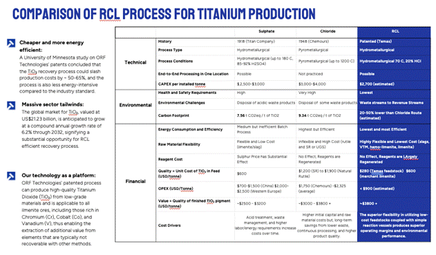 Environmental Performance: The closed-loop design and high reagent recycling rates are core to the RCL platform, irrespective of the target mineral. Over 69% lower operating costs compared to conventional processing due to its core features operating at near ambient temperatures.[3] This means the reduced environmental footprint and enhanced ESG profile are benefits that extend to ores and minerals previously noted, not just TiO2.